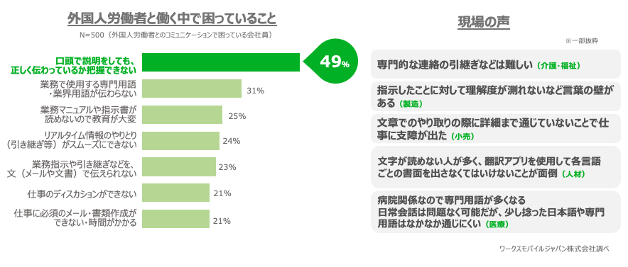 49%が「口頭で説明をしても正しく伝わっているか把握できない」と回答し、 業務マニュアルの理解などテキストコミュニケーションにも課題感