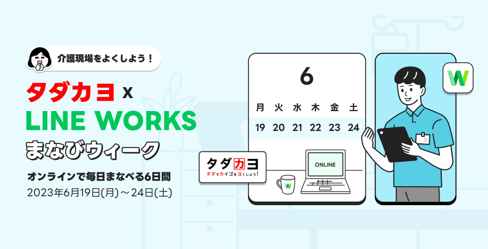 ビジネス現場のコミュニケーションツール「LINE WORKS」を提供するワークスモバイルジャパン株式会社(本社:東京都渋谷区、代表取締役社長:増田 隆一、以下 ワークスモバイルジャパン)は、介護事業所のIT活用を支援するNPO法人タダカヨ(所在地:東京都大田区、理事長:佐藤拡史、以下タダカヨ)と協同し、オンラインカンファレンス「タダカヨ × LINE WORKS まなびウィーク」を2023年6月19日(月)より6日間開催いたします。