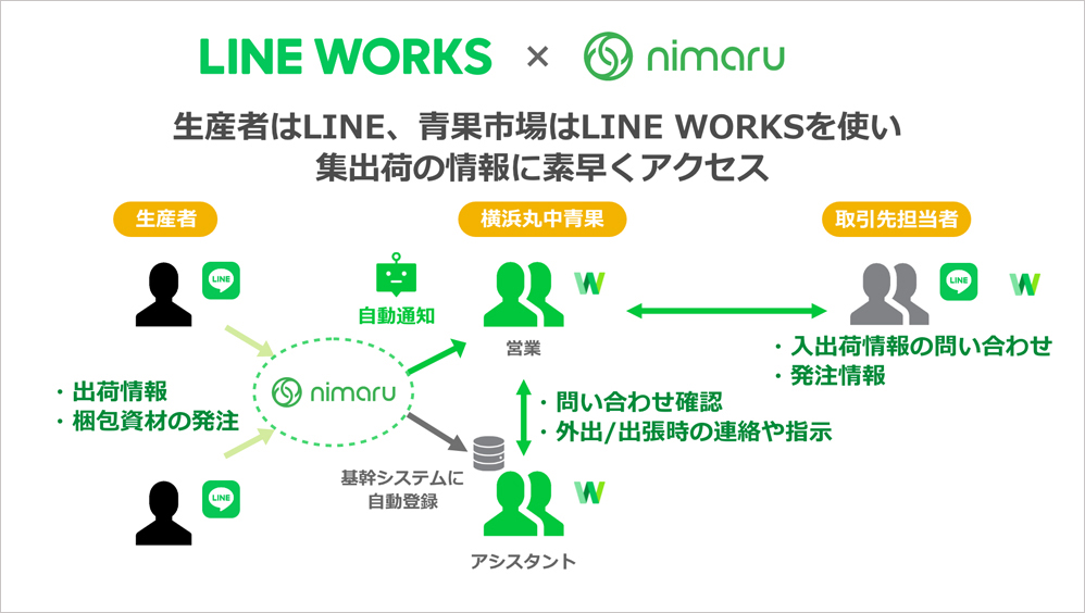 さらに、送信された帳票の内容を事務担当者が基幹システムに手動で入力する工数が発生していた横浜丸中青果株式会社では、生産者との上納のやりとりのデジタル化および業務効率化のため、農産物の流通に特化した集出荷連絡ツール「nimaru」を導入。「nimaru」はLINEや「LINE WORKS」をインターフェースとすることが可能なため、生産者側は出荷情報や梱包資材の発注など必要な情報を、LINEを使って「nimaru」に入力、青果卸売市場である横浜丸中青果は「LINE WORKS」と「nimaru」をAPI連携し※1、「LINE WORKS」から「nimaru」に入力するという仕組みを構築しました。