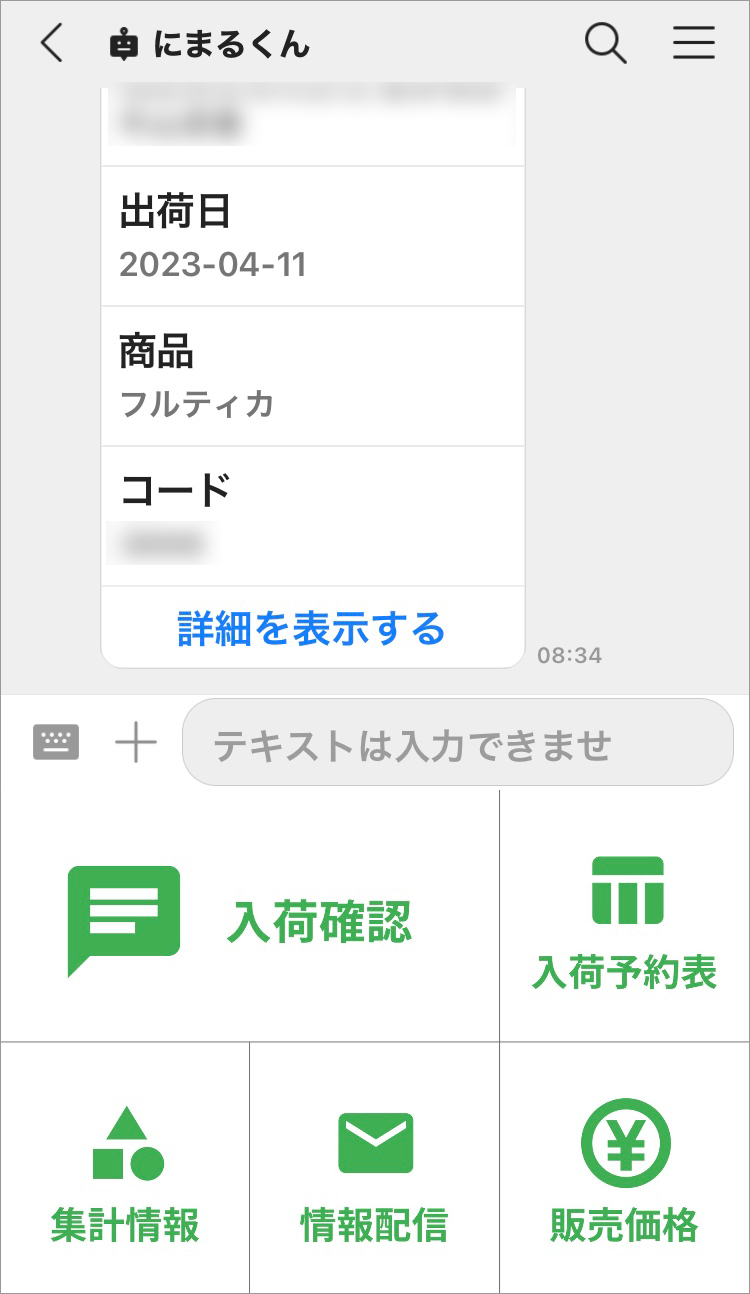 生産者がLINEからに出荷情報を登録すると、リアルタイムに「LINE WORKS」に自動通知。詳細な情報が、複数の担当者のトークルームへ一斉に共有される。横浜丸中青果では「にまるくん」と呼ばれている。