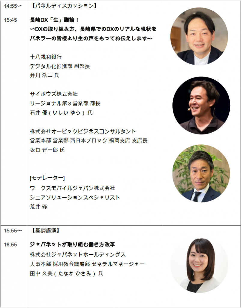 また、基調講演に株式会社ジャパネットホールディングス 人事本部 採用教育戦略部 ゼネラルマネージャー 田中 久美(たなか ひさみ)氏をお招きし、ジャパネットが取り組む働き方改革についてご紹介いただくほか、「LINE WORKS」ユーザーによる導入事例や、長崎県および県内企業のDXについてのパネルディスカッションといった充実したセッションをご用意しております。