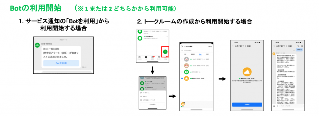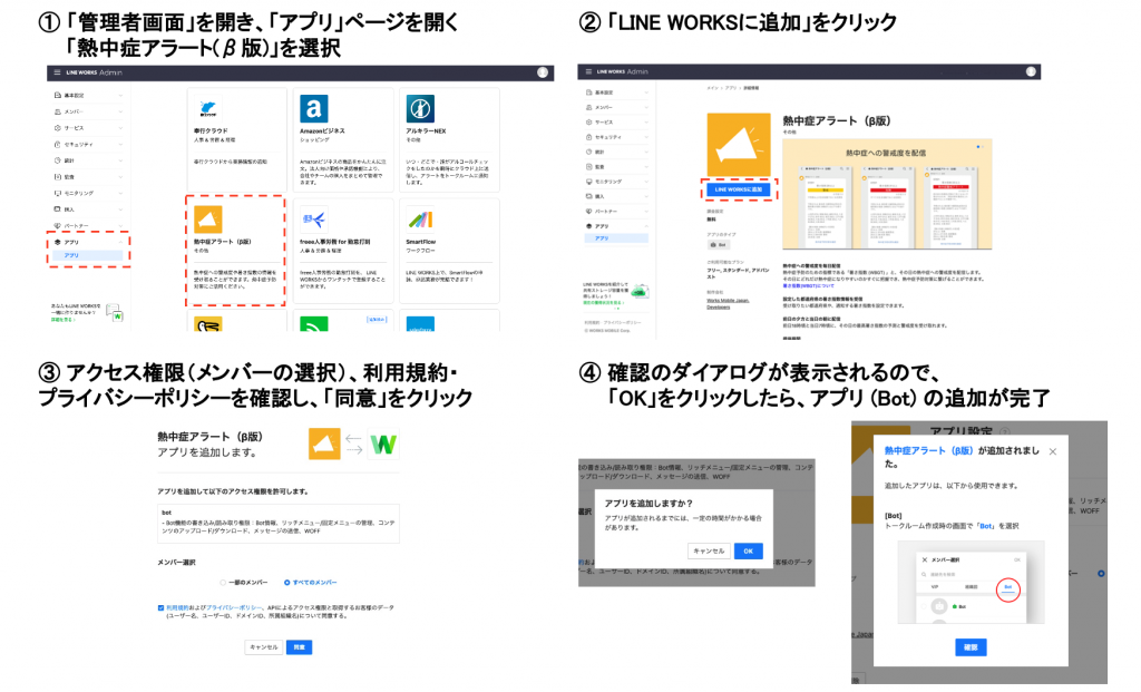 ・「LINE WORKS」アプリディレクトリ画面から「熱中症アラート(β版)」を追加