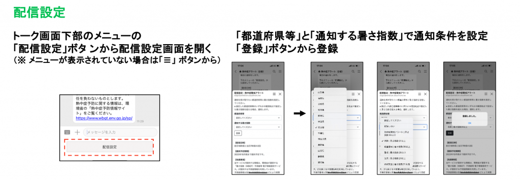 ・配信時間:前日の夕方(18時頃)と当日の朝(7時頃)に配信します。その日の最高暑さ指数の予測と警戒度を受け取ることができます。