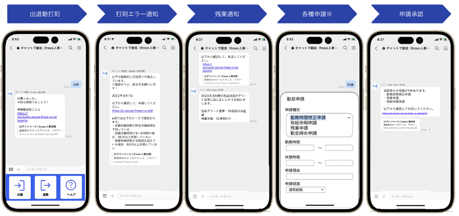 今回「LINE WORKS」のアプリ連携プラットフォーム「アプリディレクトリ」※2に追加された『チャットで勤怠(freee人事労務)』は、普段PC作業が少ないノンデスクワーカーの利用者数も多い「LINE WORKS」と、人事労務管理システム「freee人事労務」を連携したアプリケーションです。現場作業が多い業種や外出先など場所にとらわれず、LINE WORKS上から簡単に勤怠打刻と打刻漏れなどの通知・打刻不備の修正が可能となります。