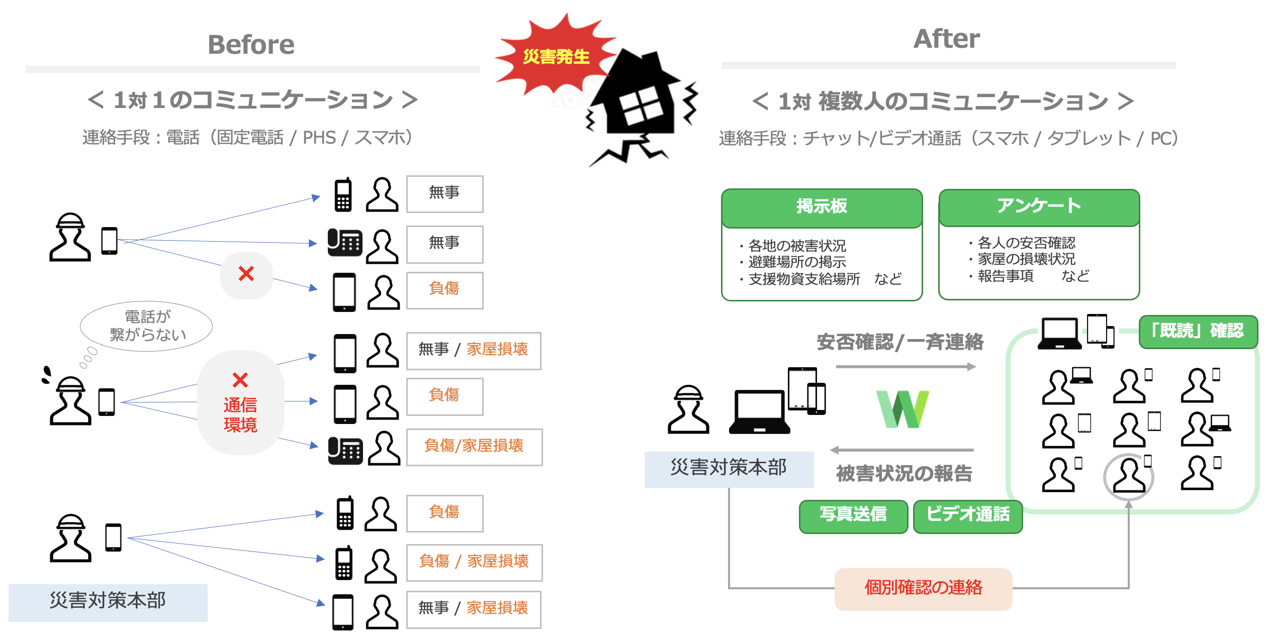 ワークスモバイルジャパンは、「LINE WORKS」の提供と、実運用への組み込みやBCP策定時のサポート・助言を行い、3社で密に協力し合いながら、実際の緊急時にも有効となる体制を整えてきました。