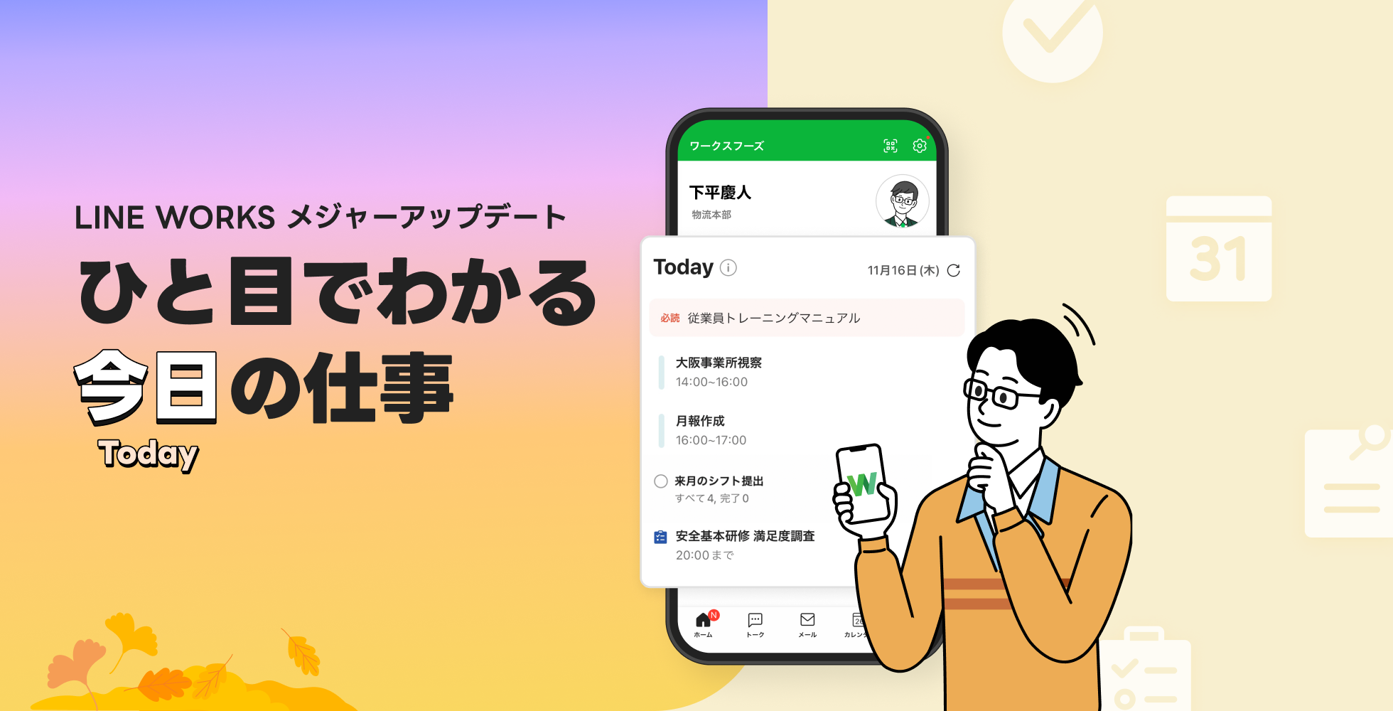 今回の「LINE WORKS」メジャーアップデートでは、テーマを「ひと目でわかる今日(Today)の仕事」とし、前回のメジャーアップデートで新しく登場した「ホーム」の機能を強化し、大事な情報を集約して自動でお知らせする新ウィジェット”Today”を追加しました。さらに、ユーザーのニーズに応え基本機能である「トーク」をさらに使いやすくしたり、メンバーの予定をより把握しやすくなるなど、仲間との仕事がより一層はかどる機能追加および改善を行いました。