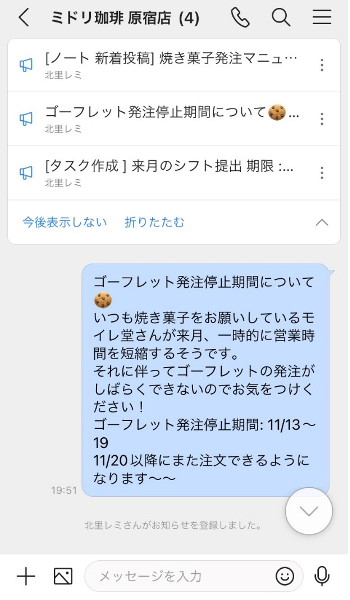さらに、重要なトークを見逃さないよう、特定のトークを「お知らせ」としてトークルームの上部に掲示できるようにしました。トークルーム内でのノートやタスクの投稿通知も「お知らせ」として登録できます(最大5件)。