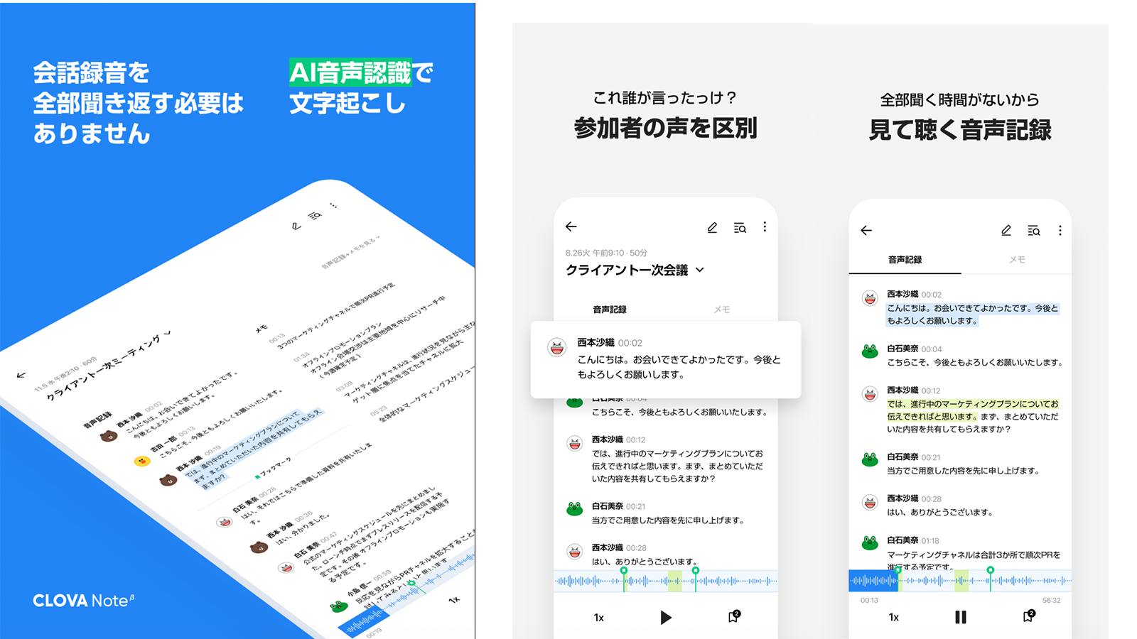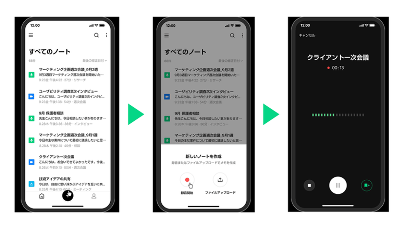 CLOVA Note βは、高精度のAI技術を活用した無料の音声記録管理サービスで、手軽に音声を文字に変換します。 シンプルで使いやすいUIで、面倒な録音からの書き起こし、会議の議事録作成、授業でのノート作成といった作業の手間を省きます。最大180分の会話を変換可能で、3人以上の会話ではAIが話者を区別し各話者ごとに会話を分けて表示します。