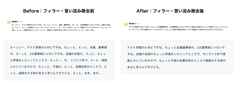 今回追加されたフィラー・言い淀み除去機能は、話者が発する「えー」「あのー」といったフィラー・言い淀みをAIが自動的に識別し、除去する技術です。これにより、文字起こしされたテキスト内の不要な言葉が削除され、より自然でクリアなテキストに変換することができるようになり、ノート全体の読みやすさや理解のしやすさを大幅に改善しています。