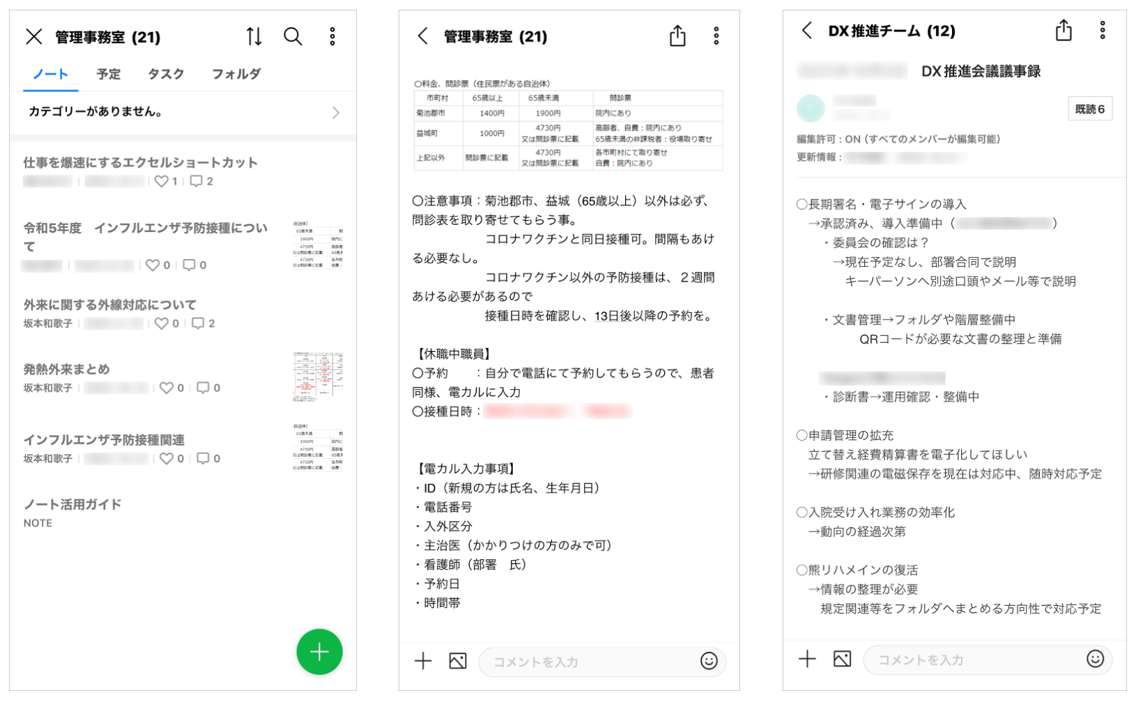 画像左:事務部のノート一覧、画像中央:インフルエンザ接種に関するノート
