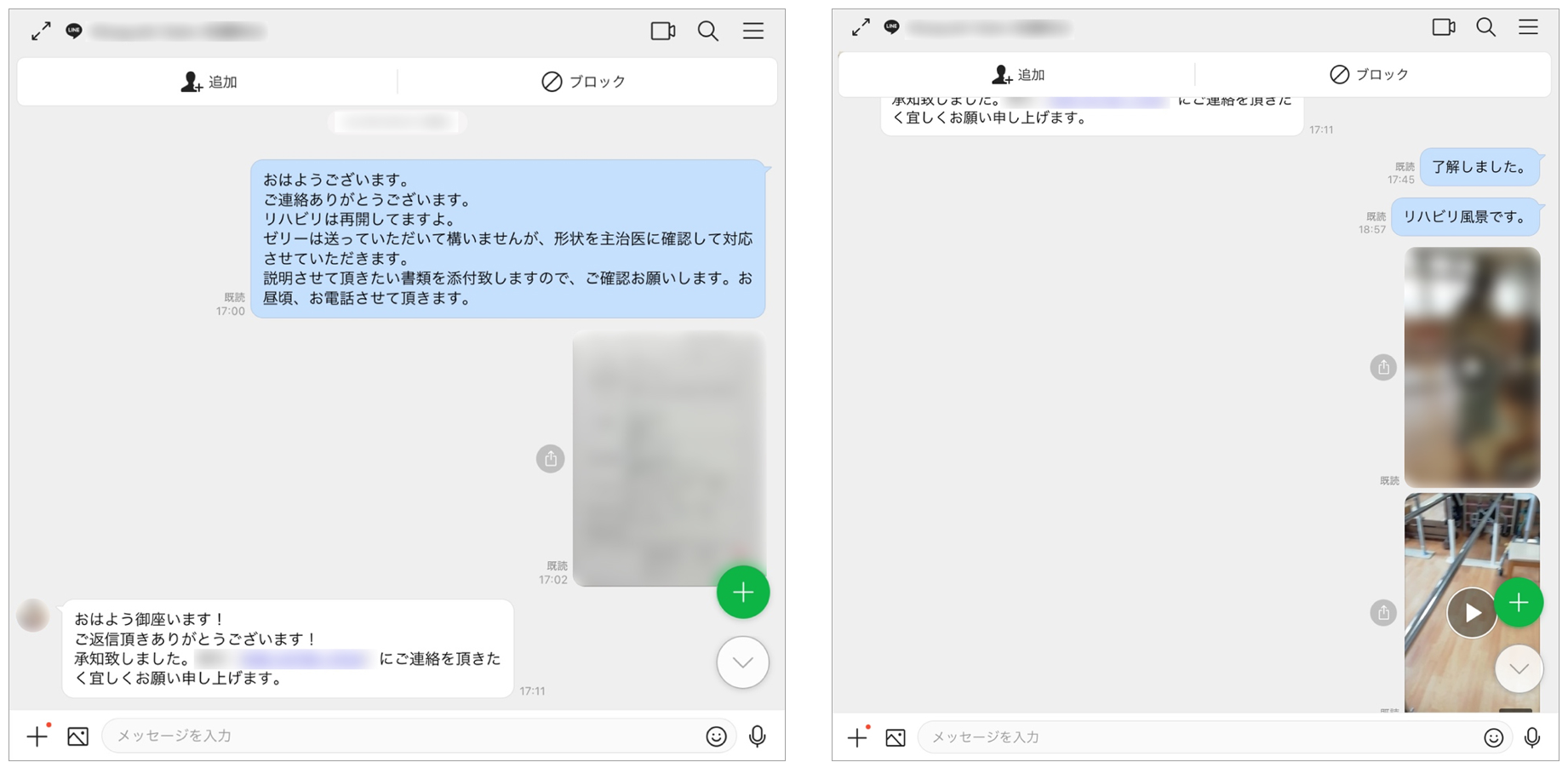 入院中の患者さんの様子やリハビリ風景の動画、関係書類などトークで共有できるようになった