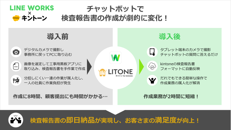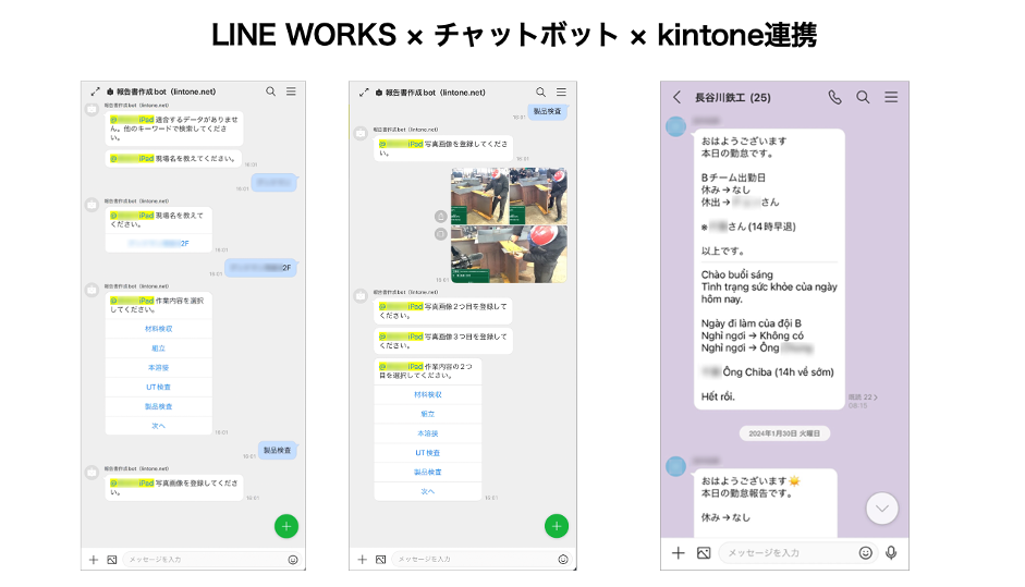 工場で製造工程の写真を撮影し、LINE WORKS上でチャットボットの質問に回答しながら撮影した写真を選択して送信するとその回答情報がkintoneに連携され、自動的に検査報告書として出力される仕組みです。