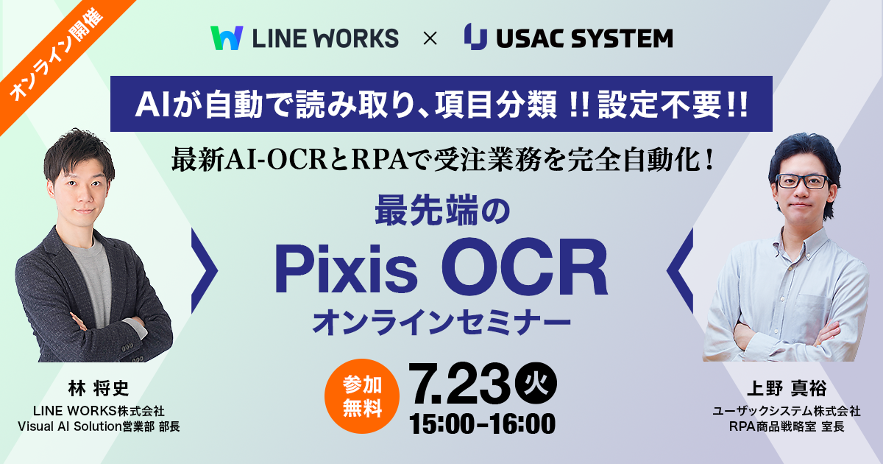 ビジネス現場のコミュニケーションツール「LINE WORKS」を提供するLINE WORKS株式会社(本社:東京都渋谷区、共同代表:島岡 岳史、増田 隆一、以下 LINE WORKS)は、業務プロセスの自動化・効率化を支援するユーザックシステム(本社:大阪市、代表取締役社長:小ノ島 尚博 以下 ユーザックシステム)が提供するRPA「Autoジョブ名人」に、LINE WORKSが提供する「LINE WORKS OCR」の注文書特化型AI-OCRを連携したことをお知らせいたします。これは「Autoジョブ名人」の新機能「Pixis OCR」として、2024年7月2日からユーザックシステムより提供開始されます。
