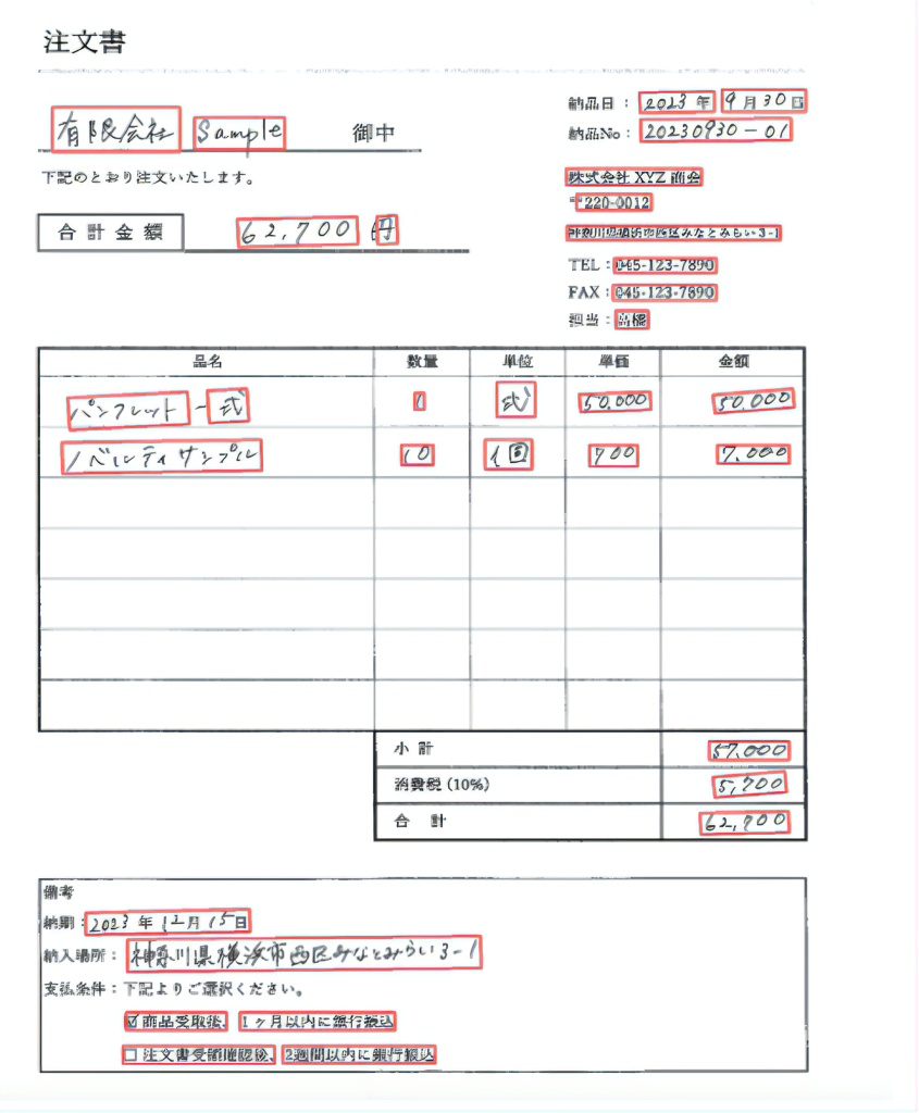 注文書のレイアウトに左右されず、AIが注文書に必要な項目を認識し、項目分類も自動で行いデータ化される。
