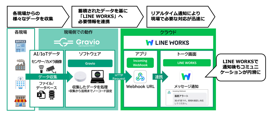 「Gravio」は、様々なIoTセンサーやAIカメラからデータを収集し、リアルタイムで分析や自動化を行うプラットフォームです。以前より「LINE WORKS」と連携したチャットボット機能で、「Gravio」を通じて異常や重要なイベントが発生した際には、「LINE WORKS」上に即座通知を行うことができました※2 が、今回連携した「Incoming Webhook アプリ」によって、その仕組みがより簡単に構築できるようになりました。