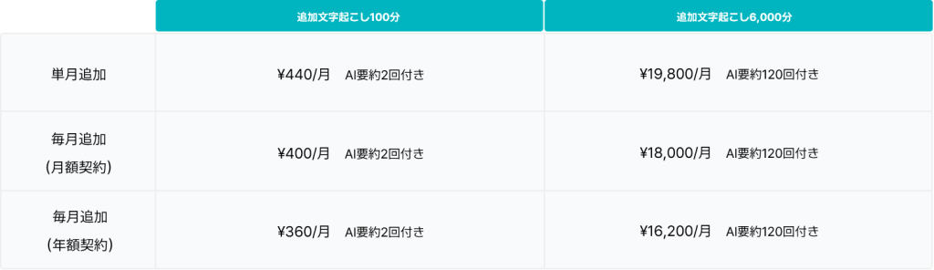 有料版をご利用の方には、ドメイン内で共有できる文字起こし時間の追加オプションもご提供します。100分のオプションにはAI要約2回分、6000分のオプションにはAI要約120回分が付与されます。