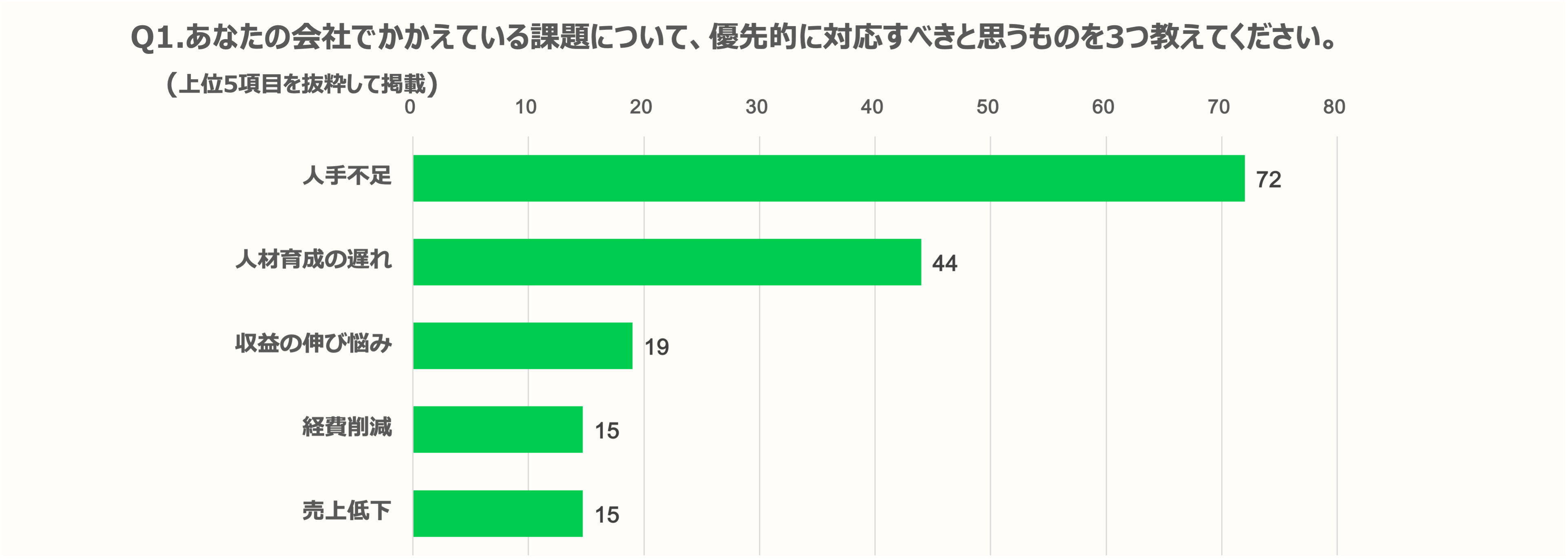 企業でかかえている課題は、「人材不足」が7割以上(72%)と最も多く、「人材育成の遅れ」44%と続いた。