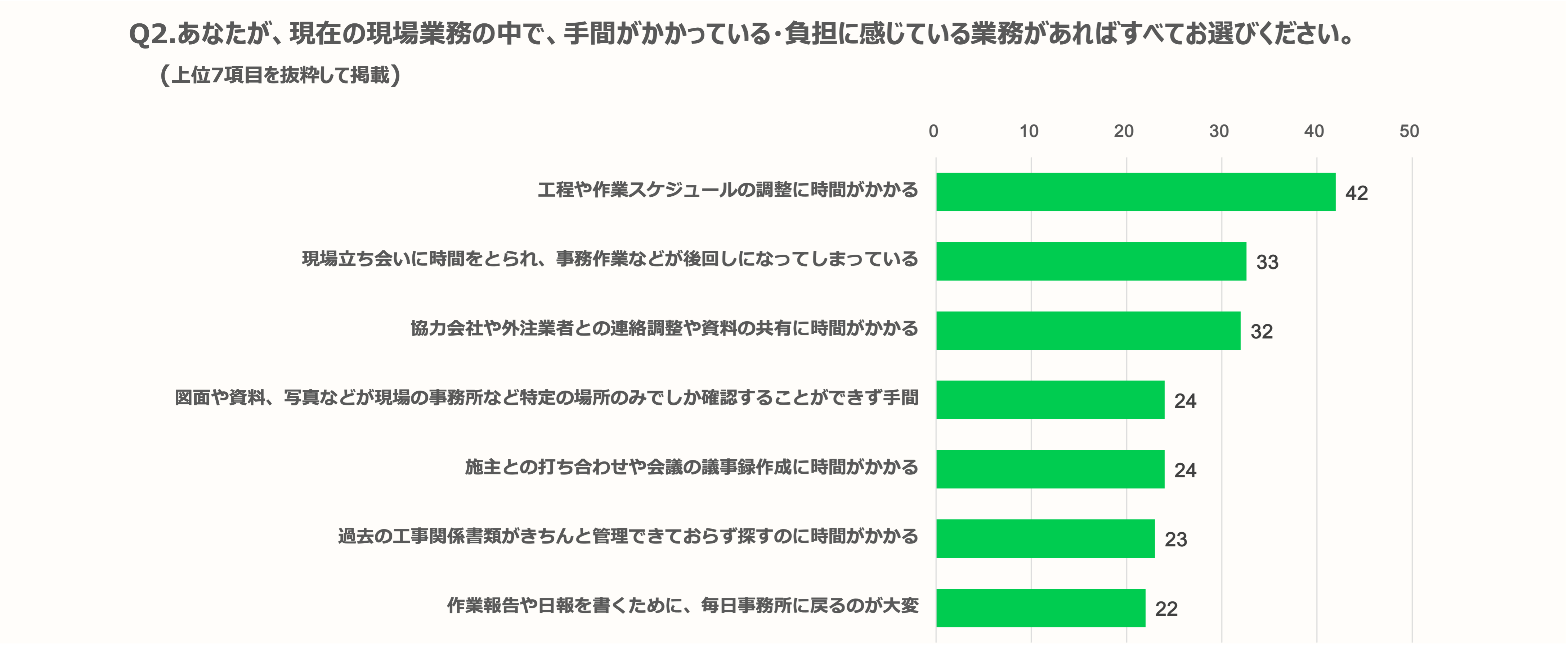現場で手間がかかっている・負担に感じている業務については、「工程や作業スケジュールの調整に時間がかかる」最多の42%、「現場立ち会いに時間をとられ、事務作業などが後回しになってしまっている」33%、「協力会社や外注業者との連絡調整や資料の共有に時間がかかる」32%がトップ3という結果となった。