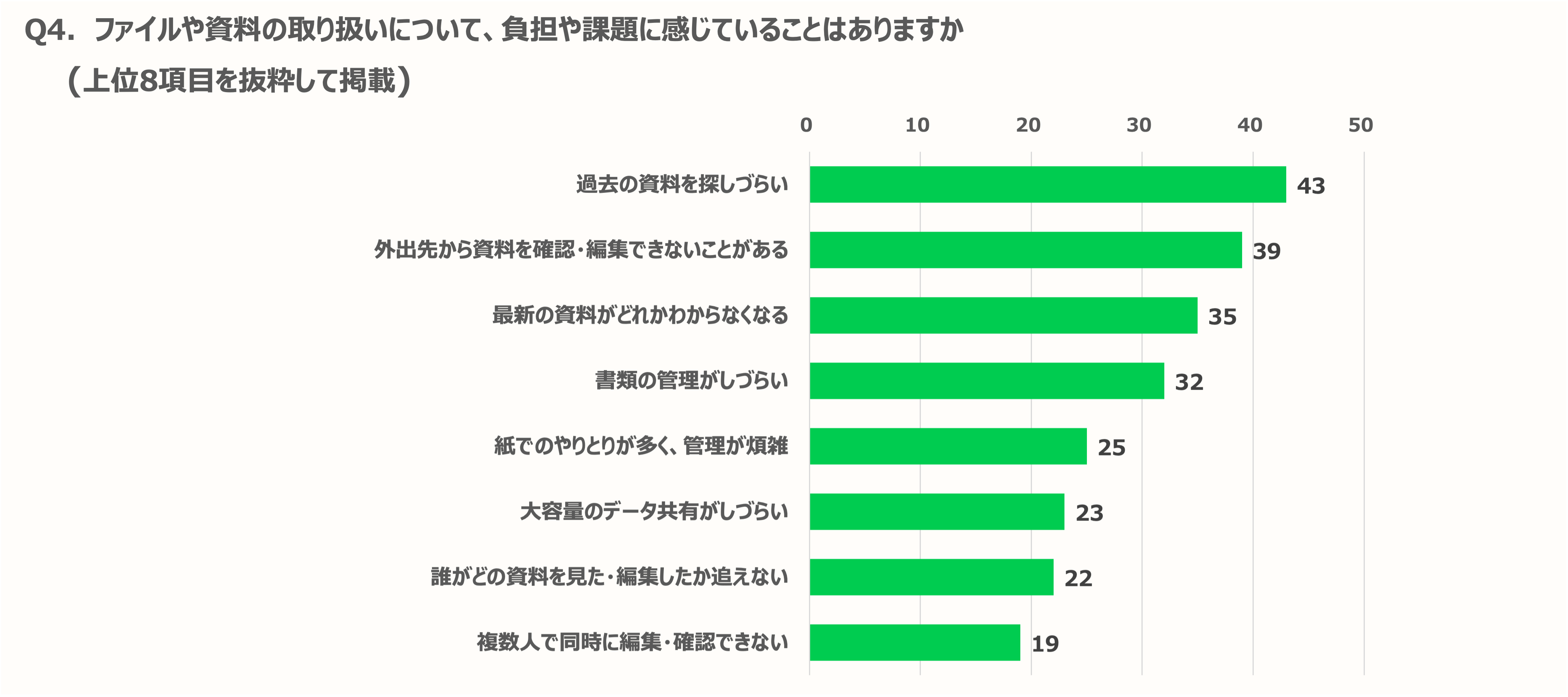 資料・ファイルの管理・共有については、4割が紙で行っているという回答があり、「過去の資料が検索しづらい」「外出先から確認できない」といった運用に関する課題の声が上がっています。