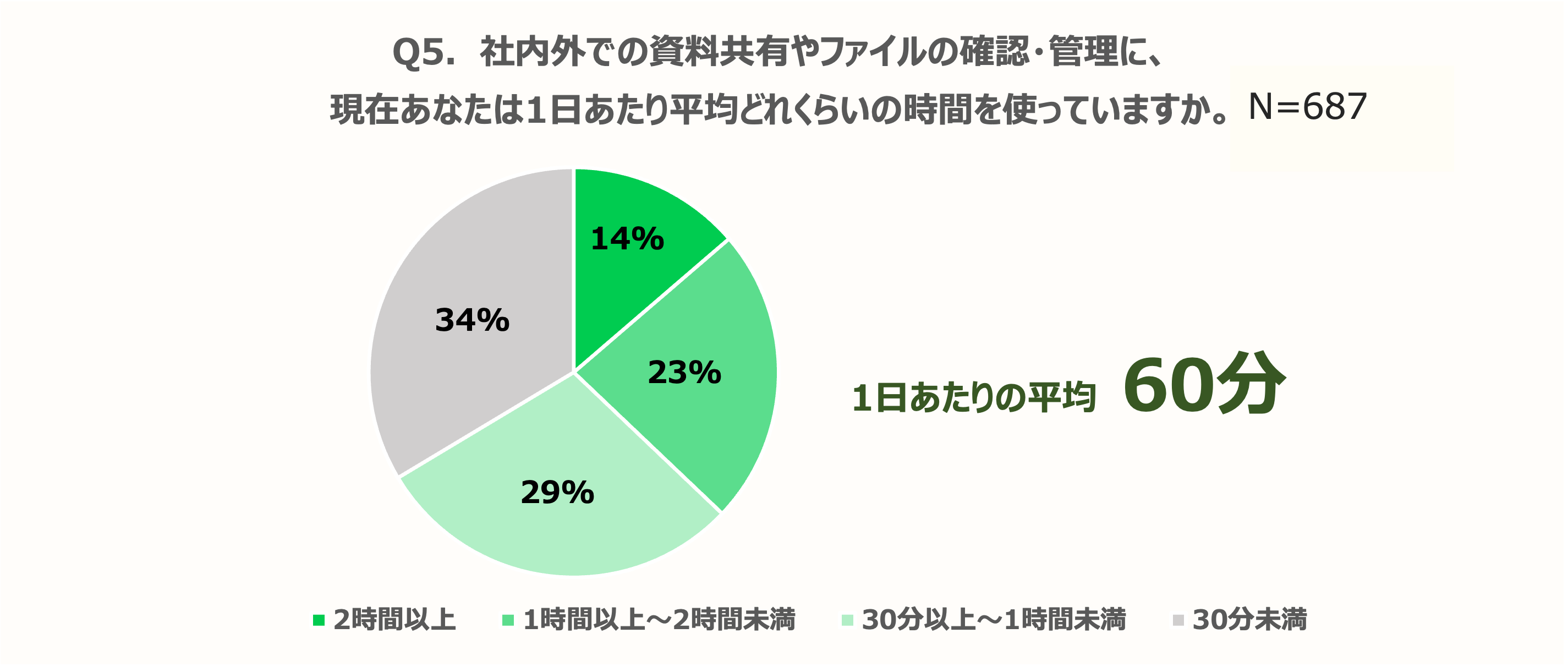 ファイルや資料の取り扱いにおいて負担や課題に感じていることについては、「過去の資料を探しづらい」43%、「外出先から資料を確認・編集できないことがある」39%が上位にあがり、社内外の資料共有やファイルの確認・管理に1日あたり平均 60分の時間を使っている。