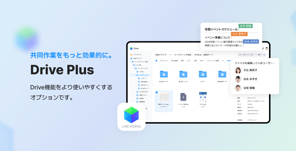 「LINE WORKS」のオプションサービスである「Drive Plus」は、ファイルの保管・共有に加えて、直接編集や複数人での同時作業、CADファイルのプレビューなど、現場業務で求められる機能を幅広くカバーしています。場所やデバイスを問わず、図面・資料の確認から共有、編集までをシームレスに行えるため、建設現場や出先でもスムーズな業務遂行を支援します。