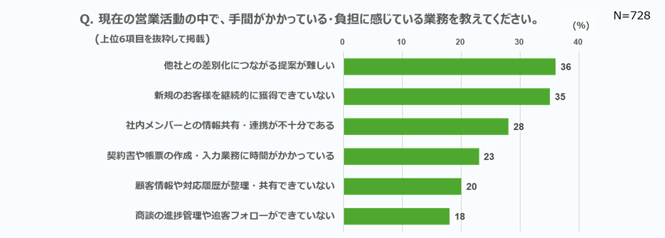 36%、「新規のお客様を継続的に獲得できていない」35%が上位2項目にあがり、「社内メンバーとの情報共有・連携が不十分である」28%、「契約書や帳票の作成・入力業務に時間がかかっている」23%が続いた。