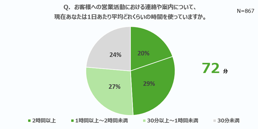 営業活動における連絡や案内にかけている時間については、1日あたりの平均時間は「2時間以上」20%、「1時間以上〜2時間未満」29%で、全体の約半数が「1時間以上」時間をかけていた。また、平均時間は 72分であった。