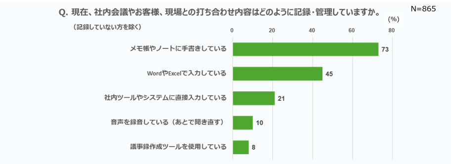 会議やお客様との打ち合わせ内容の記録方法については、「メモ帳やノートに手書きしている」が73%で最も多く、「WordやExcelで入力している」が45%と続いた。