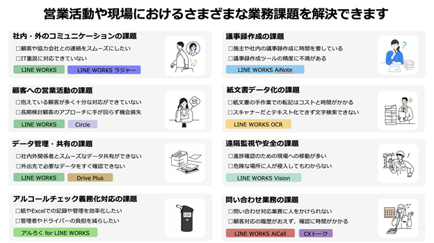こうした現場課題に対して、LINE WORKSでは業務全体を複数の製品を通じて以下のようにサポートしています。日々の連絡や情報共有、打ち合わせ記録など、それぞれの業務に合わせたツールを組み合わせて活用いただくことで、営業担当者が本来注力すべき営業業務や顧客対応に、しっかりと時間を割ける環境づくりに貢献します。