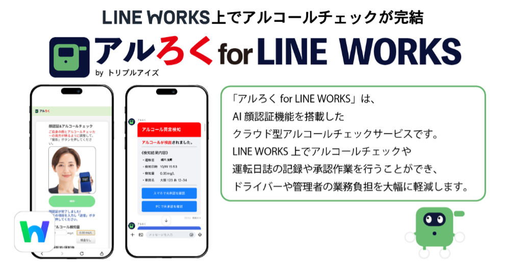 「アルろく for LINE WORKS」は、アルコールチェックや運転日誌の記録を「LINE WORKS」上で実現するAI顔認証付きクラウドアルコールチェックサービスです。「LINE WORKS」上でアルコールチェックや運転日誌の記録、承認作業を行うことができ、ドライバーや(安全運転)管理者の業務負担を大幅に軽減します。