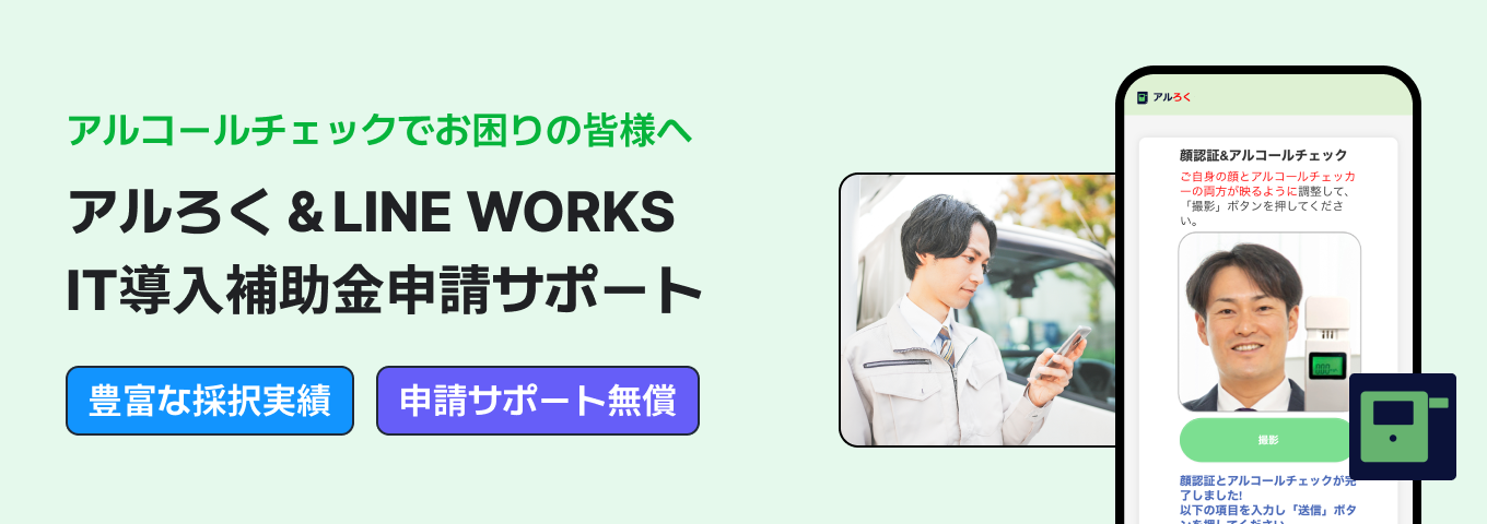 IT導入補助金を活用して「アルろく for LINE WORKS」「LINE WORKS」を導入したい事業者向けに、申請するための必要書類の取得方法や提出資料の作成まで、複雑な申請業務を無償でサポートいたします。ぜひこの機会に「アルろく for LINE WORKS」「LINE WORKS」の導入をご検討ください。※申請サポートを無償でご利用いただくには、一部条件がございます。詳しくは以下までお問い合わせください。