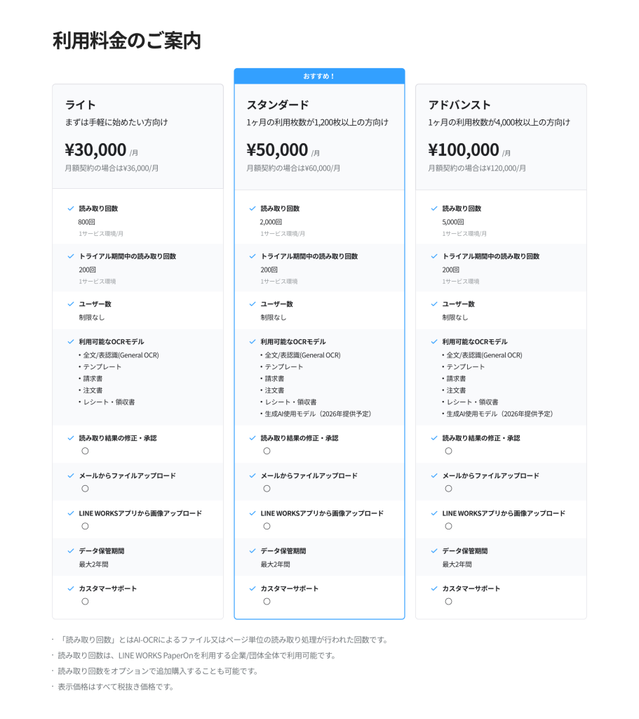 「LINE WORKS PaperOn」とは、紙帳票の読み取りから、修正・データ変換・システム連携・保管までをひとつのツールで対応可能な文書処理業務サービスです。現在提供している「LINE WORKS OCR」では、文書の読み取りに特化していますが、「LINE WORKS PaperOn」は、文書の読み取りだけでなく、必要に応じて内容を自動で修正、補足することが可能となります。