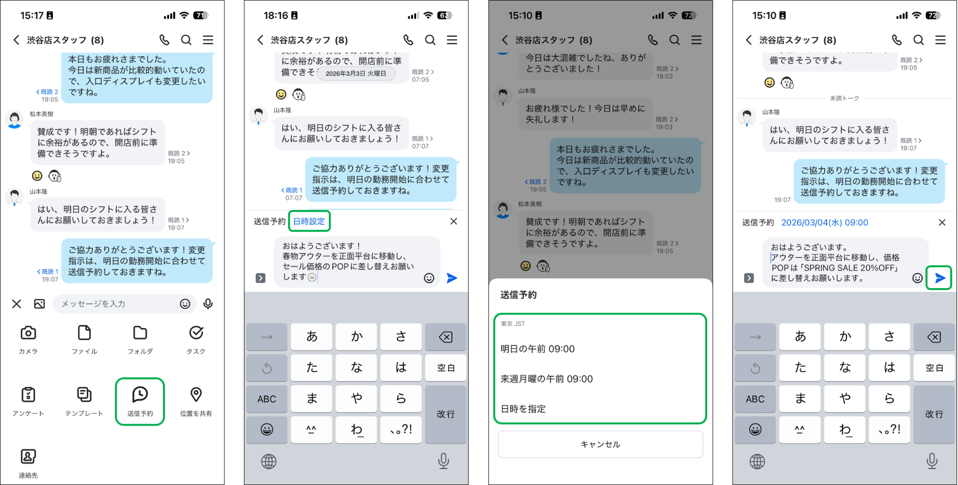 今回のアップデートでは、このような背景とユーザーから寄せられた要望を踏まえ、従業員・スタッフの勤務状況や、“つながらない権利”に配慮しながらも、円滑な業務連絡を可能にする「送信予約」機能を追加しました。