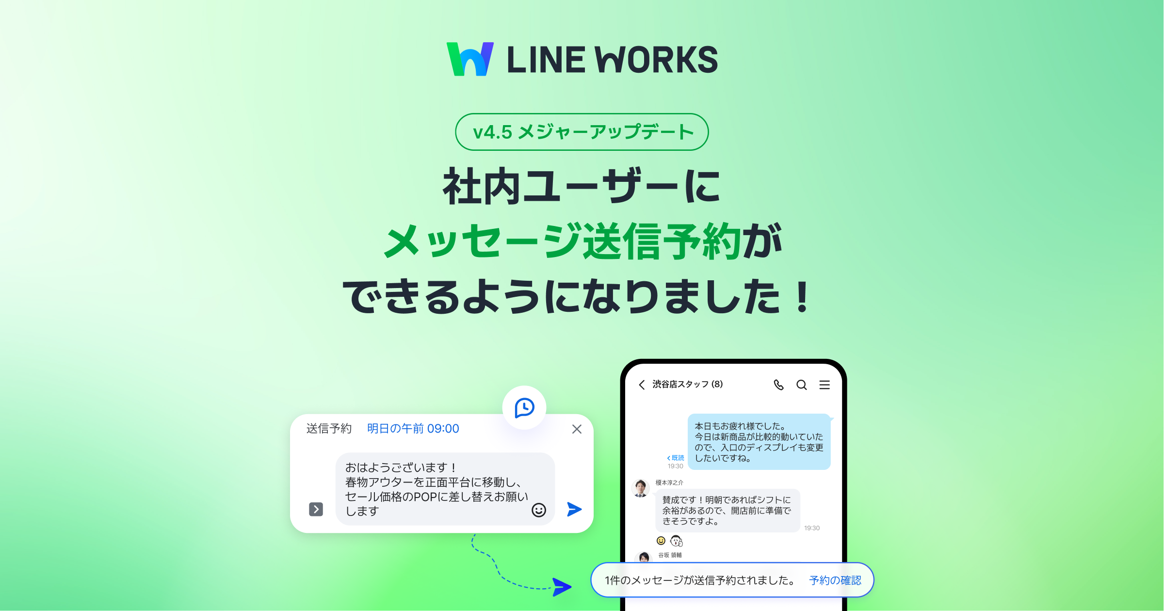 今回の「LINE WORKS」メジャーアップデートでは、指定日時にメッセージ送信が可能になる「送信予約」機能を新たに追加しました。