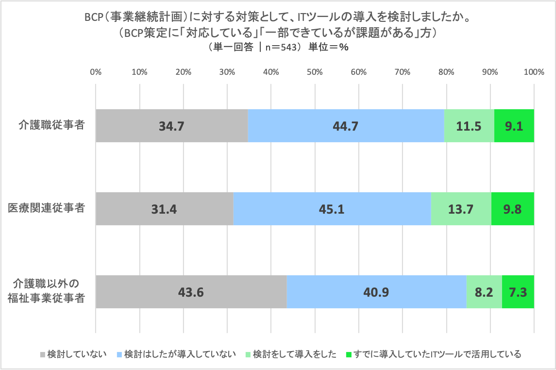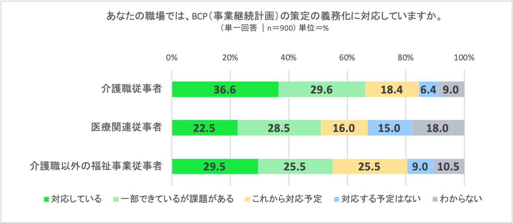 介護職従事者の36%がBCP策定対応済みと回答。医療関連従事者および福祉事業従事者では、対応済みが3割以下に留まり、福祉事業従事者については「一部できているが課題がある」と「これから対応予定」の合計が半数を超えた。