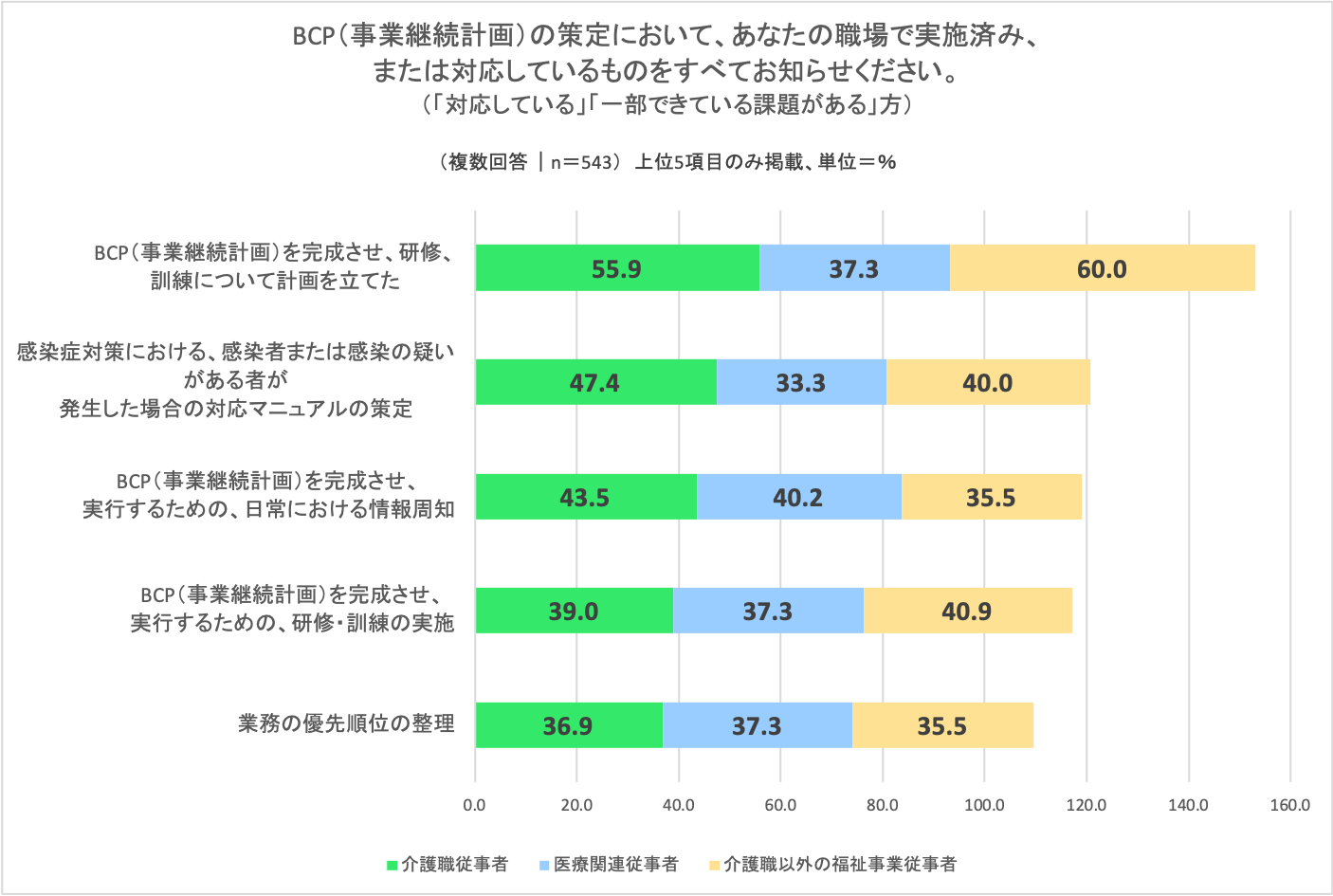 1.介護職従事者の36%がBCP策定対応済みと回答。医療関連従事者および福祉事業従事者では、対応済みが3割以下に留まった。