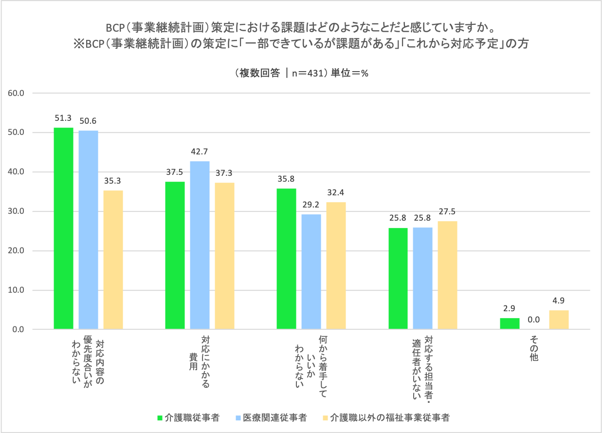 BCP策定対応中、またはこれから対応予定の場合に、介護職および医療関連従事者においては「対応内容の優先度合いがわからない」を課題として挙げる事業者が半数を超えた。福祉事業従事者においては「対応にかかる費用」がトップ(37.3%)となり、コストへの課題意識も見られた。