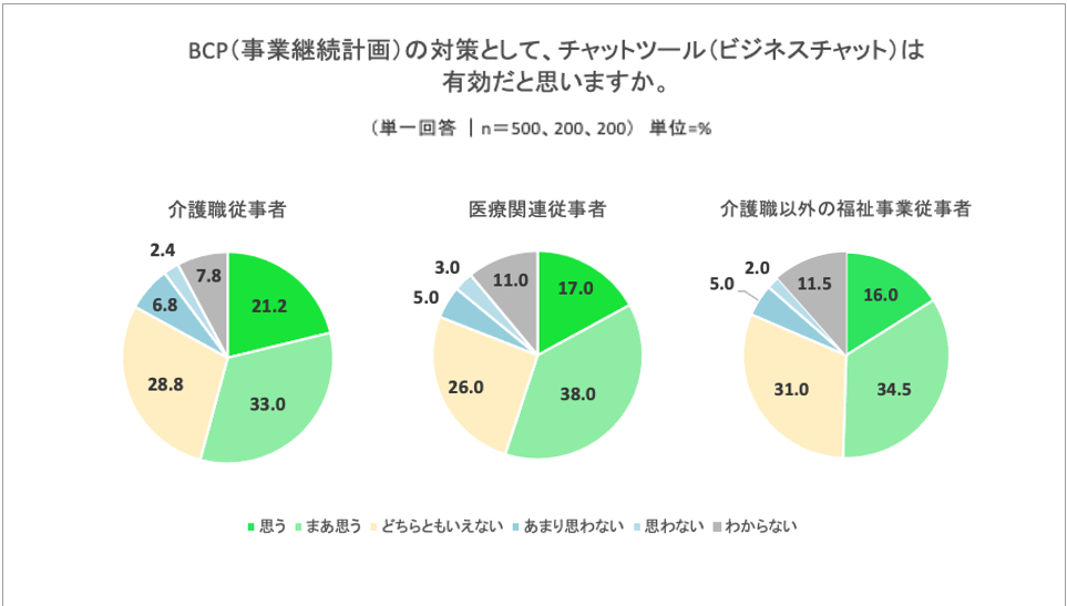 BCP対策として、チャットツール(ビジネスチャット)が有効である(思う・まあ思う)と答えた介護/医療/福祉従事者は半数を超え、BCP対策への有効性が期待されている。