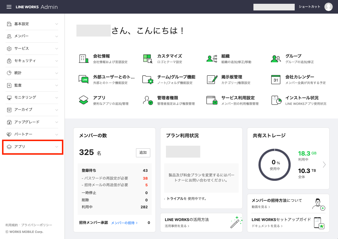 1. LINE WORKSの管理者画面「アプリ」メニューをクリック。