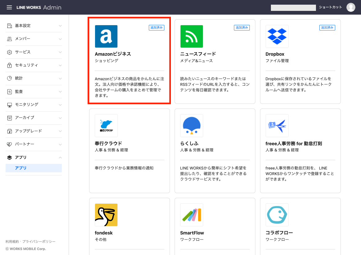 ・アプリのバージョンアップは、LINE WORKSの管理者画面「アプリ」から操作できます。