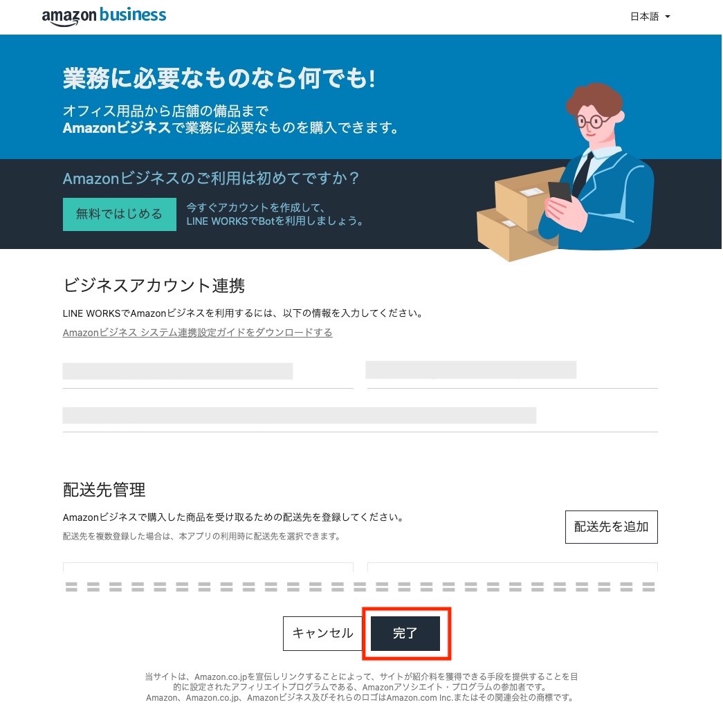 4.(「Amazonビジネス」アプリの場合は)連携設定ページに表示されている「完了」ボタンをクリック。