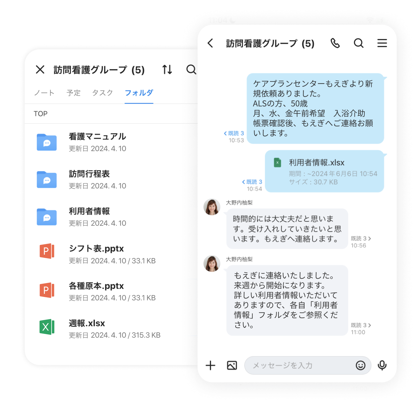 看護スタッフ同士、訪問看護ステーション内にいるスタッフ同士や本社のスタッフとのやりとりにLINE WORKSを利用しています。LINE WORKSが導入されてからは、訪問看護用紙などを撮影して画像で送り、情報共有や引き継ぎに活用しています。セキュリティが確保されているので、個人情報を隠す作業が不要になり、すごく楽になりました。
