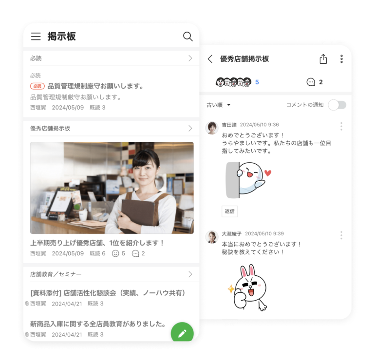 また、最新業界ニュースや優秀店舗の運営ノウハウなど、店舗間で情報共有することで、売り上げアップにも寄与します。