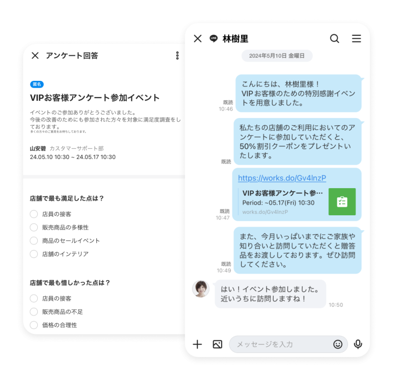 イベントやセールの情報をダイレクトに顧客のLINEに配信したり、顧客の問い合わせにトークでリアルタイムに対応することができます。