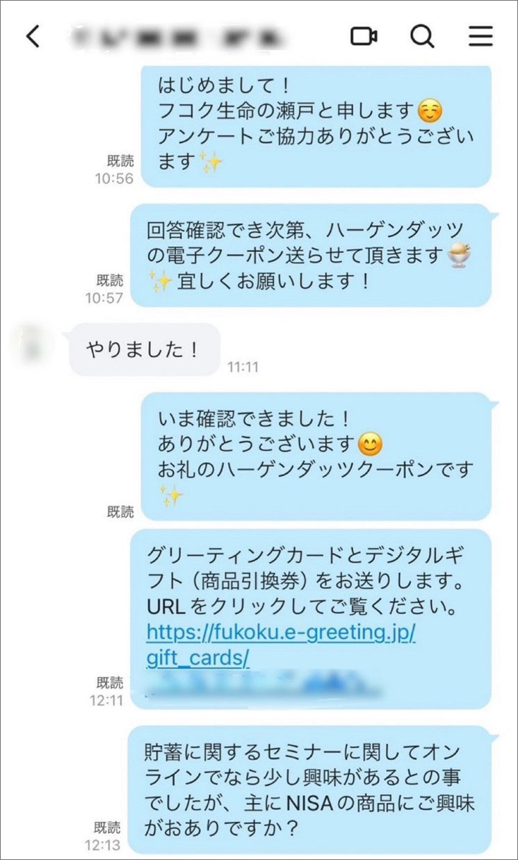 此外,對於同意洽談的客戶,我們有時會致贈可在便利商店等地使用的電子禮物以示感謝。能利用移動時間等方便地進行溝通,也是LINE WORK 的一大優點。