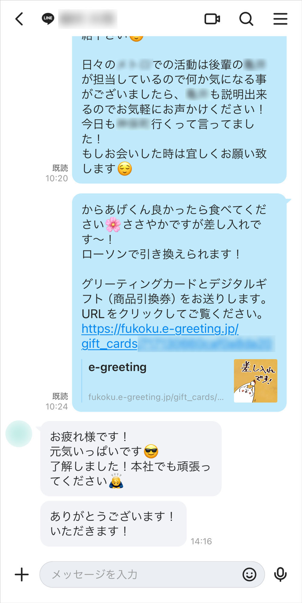 此外,對於同意洽談的客戶,我們有時會致贈可在便利商店等地使用的電子禮物以示感謝。能利用移動時間等方便地進行溝通,也是LINE WORK 的一大優點。