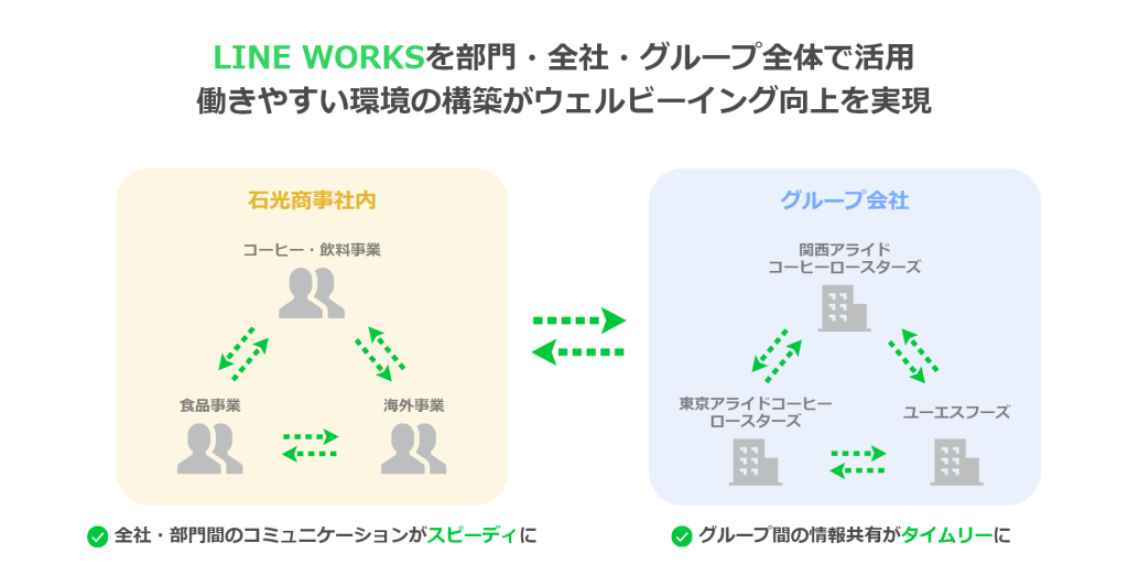 進出口咖啡飲料和食品的綜合貿易公司──石光商事股份有限公司,為了提升包含集團公司在內的部門內部聯絡效率,導入了LINE WORKS。運用訊息、行事曆、問卷等功能,可以靈活地分享資訊,同時透過佈告欄向所有員工告知來自總經理的訊息或公司所進行的社會貢獻活動內容,提高員工們對社會貢獻的參與意識。此外,利用Bot處理公司內部的常見問題,減輕諮詢業務負擔,並建立讓員工能夠安心提問的溝通環境,有助於打造更舒適的工作職場。
