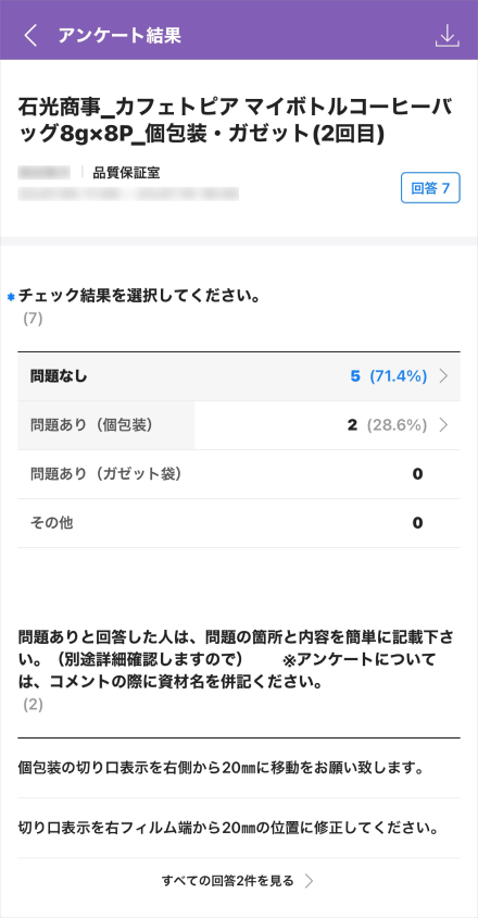 導入LINE WORKS後,我們使用問卷功能將設計圖稿以圖片形式附加於問卷中,並一併傳送給相關人員,問卷答覆也以驚人的速度收集而成。此外,系統還有針對未回覆的人員的再次提醒功能,我們現在能在一週左右就完成所有審核,從而加快了新產品的開發速度。