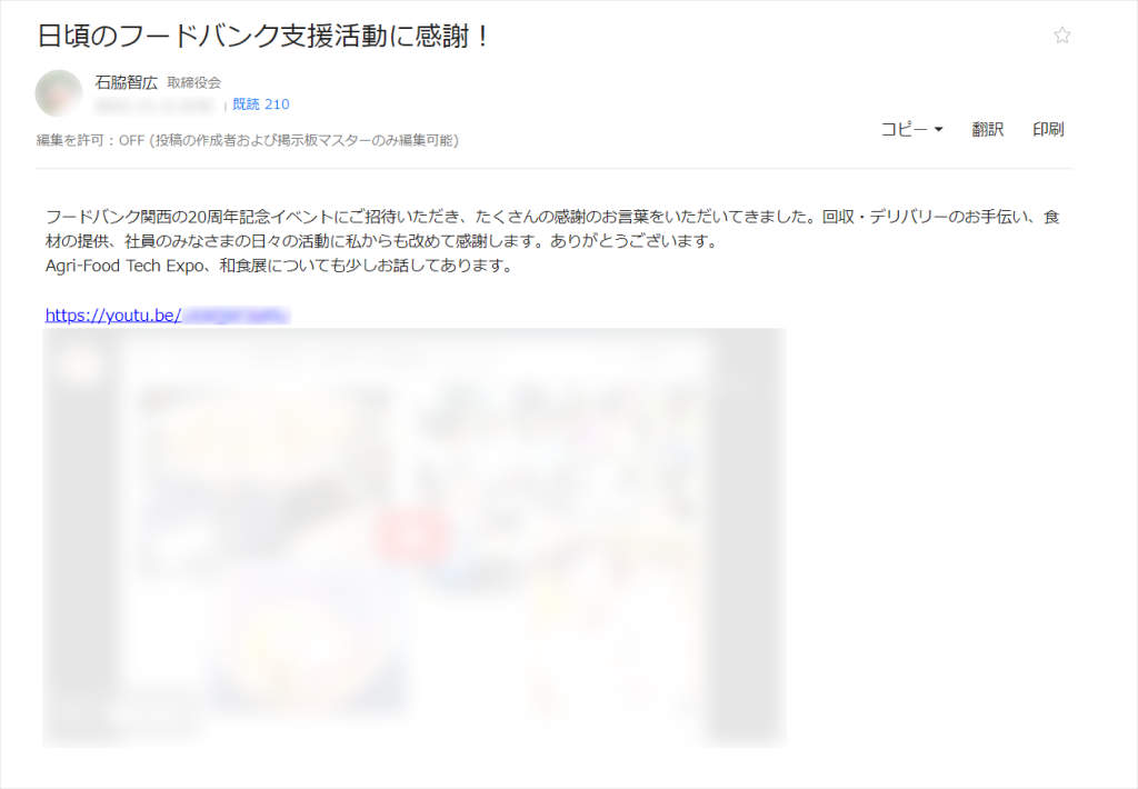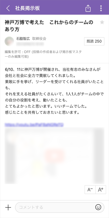 我們在佈告欄建立了總經理專屬的發佈專區,用於回顧每週工作或向員工傳送訊息。 我們公司在全國設有分店,員工平常沒有機會直接接觸總經理,但透過總經理發佈的資訊,不僅可以向所有員工傳達公司最高經營者的經營理念,也有助於拉近高層與員工之間的距離。
