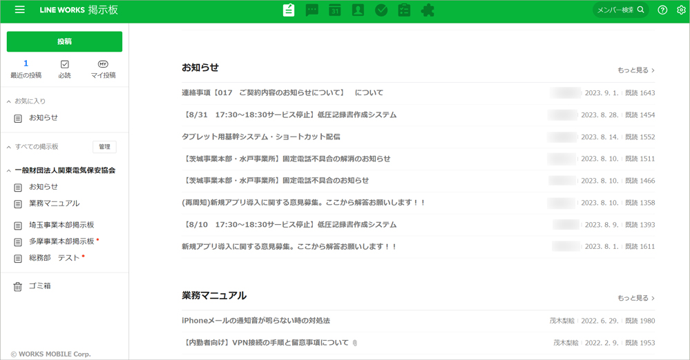 開始導入時,我們發現有些人還不是很常使用LINE WORKS,因此我們持續在持續透過佈告欄推廣操作方式。佈告欄的發佈通知會一次性發送給所有職員,這樣同一個地方的職員可以互相教導如何使用,也幫助推動了更簡便的使用方式。此外,我們還決定將過去通過電子郵件傳送的各種業務系統發布資訊、故障通知等,轉移到佈告欄上發佈。由於IT相關資訊的問題對檢查員和事務職員都很重要,因此這也促進了大家養成經常查看LINE WORKS的習慣。